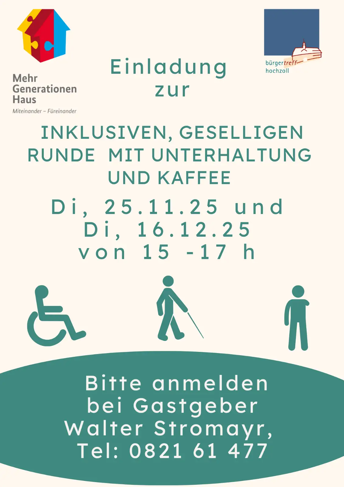 Organisiert von Walter Strohmayer. Ihm ist es ein Anliegen Mitmenschen mit mobilitäts-Problemen miteinander ins Gespräch zu bringen.Wer zu diesem Treffen kommen möchte, möge sich bitte telefonisch (am Anrufbeantworter) anmelden. 0821-61477
